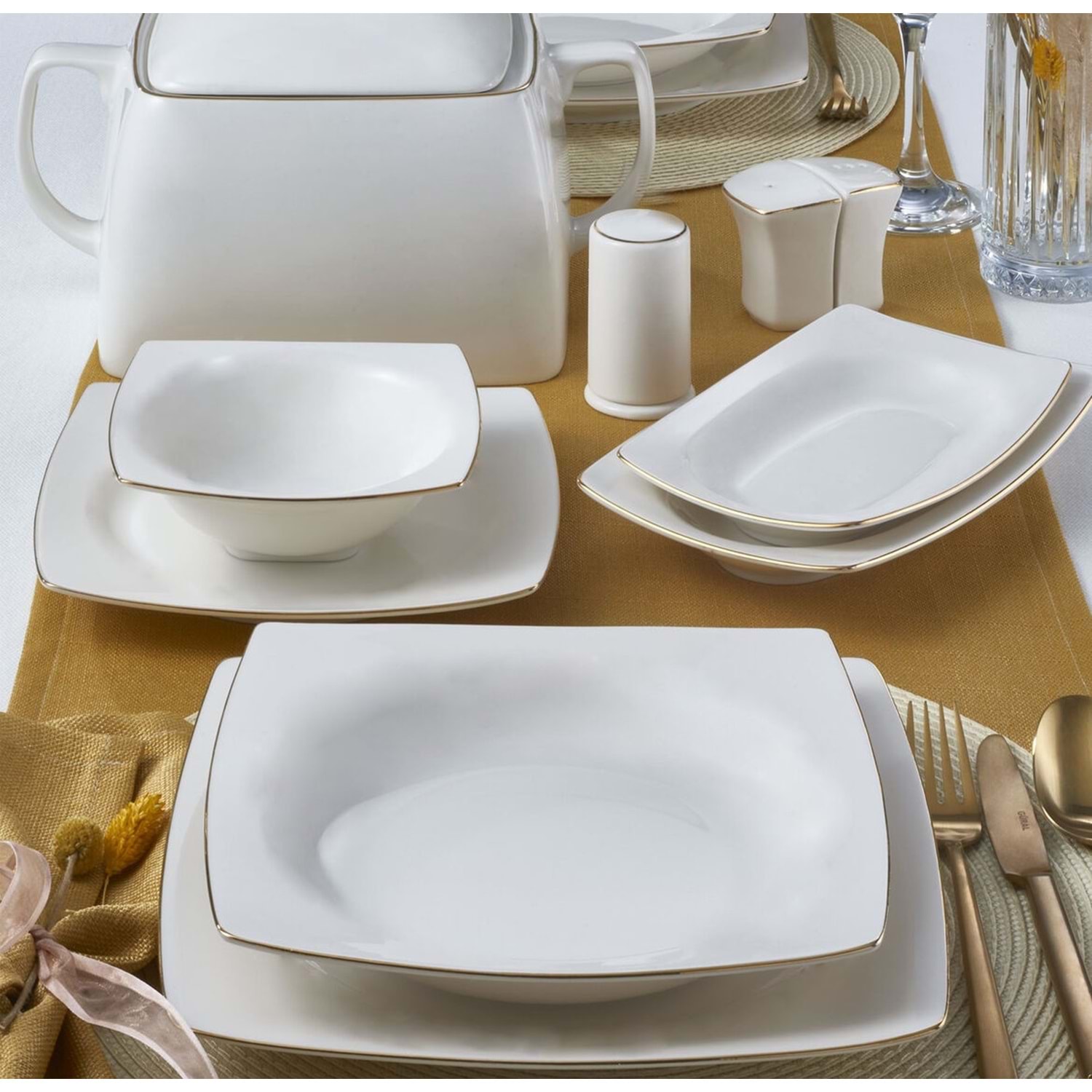 Caroline 62 Parça 12 Kişilik Kare Yemek Takımı Altın Yaldız 20